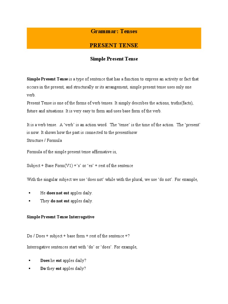 My son makes his bed. Just use the base form of the verb: Simple present tense formula chart. It is used to describe habits, unchanging situations, general truths, and fixed arrangements. Subject + verb + s/es if subject is 3rd person singular (he, she, it, name of single person etc.) example: For example, he eats apples daily. The rubbish is collected once a week. I take a bath every morning. Negative sentences in the simple present tense. The simple present tense is one of several forms of present tense in english. Simple present tense is one of the forms of verb tenses that refers to the present time. Depending on the person, the simple present tense is formed by using the root form or by adding ‑s or ‑es to the end. Subject + is/am/are + verb(+ing) example: